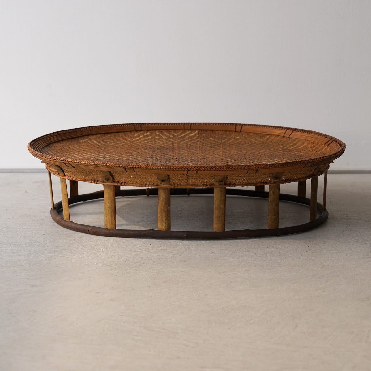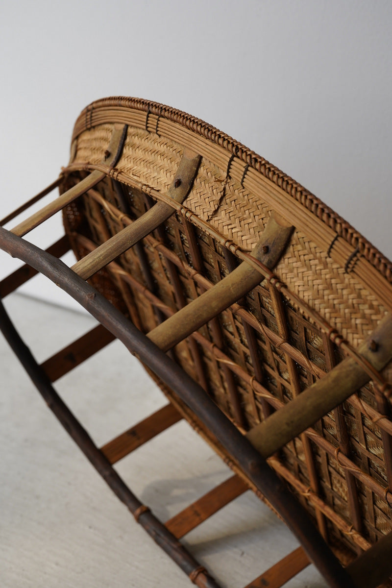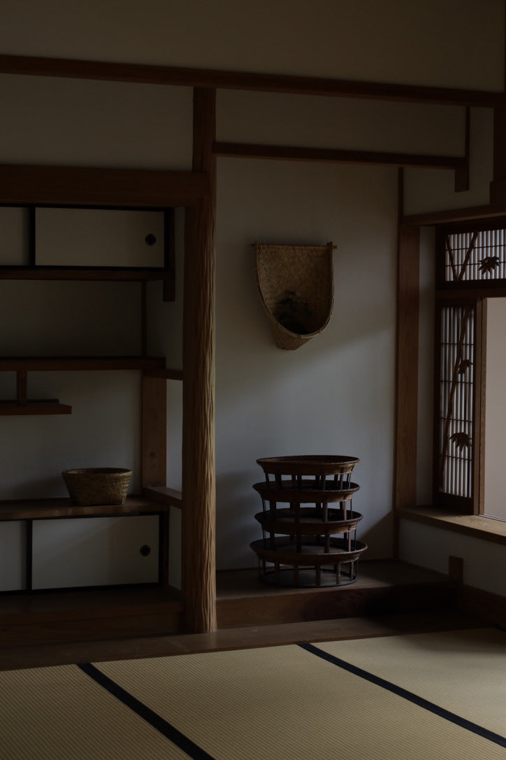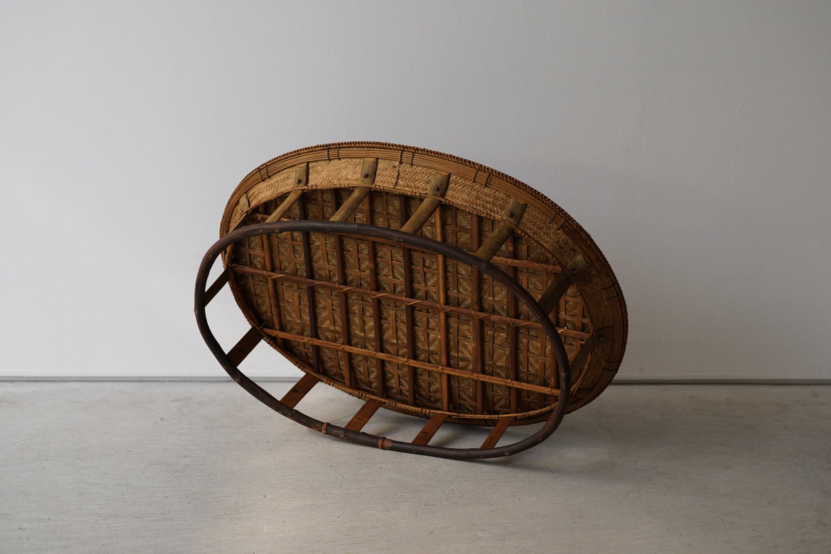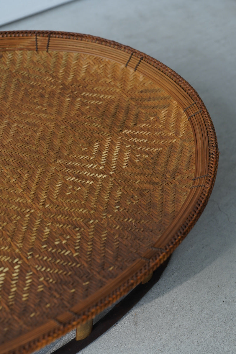 本品は、釜戸のある部屋で保管されていたため、竹に燻香(くんこう)や煤が自然に移っています。これはラオスの生活環境と製作背景に由来するものであり、防腐・防虫効果をもつ自然な仕上げとも言えます。ご使用上問題はございませんが、気になる場合は風通しの良い場所にしばらく置いていただくことで軽減されます。