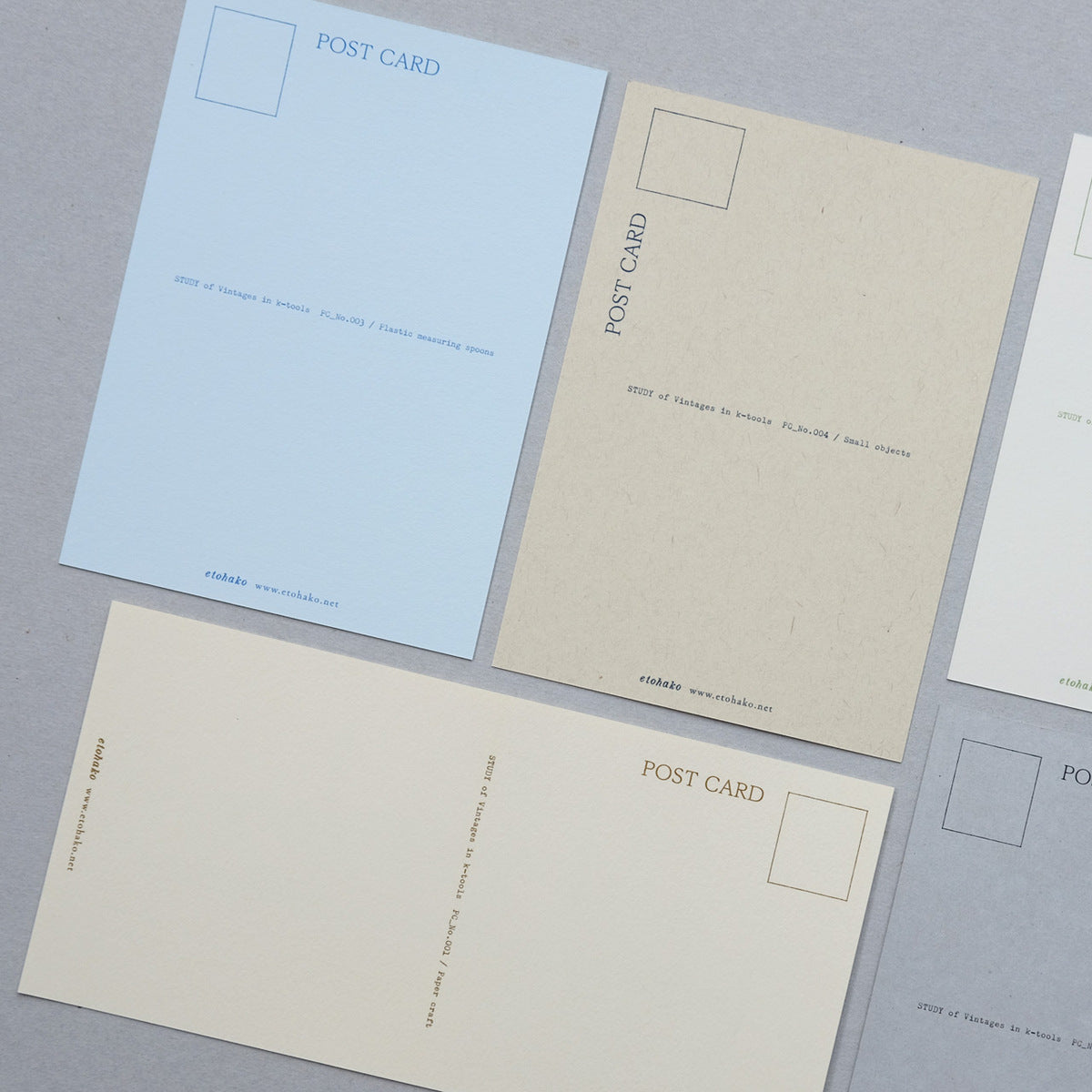 形も素材もさまざまな古道具のおもしろさをイメージした、大きさ・紙質・印刷の質感もさまざまなカード5枚セットです。